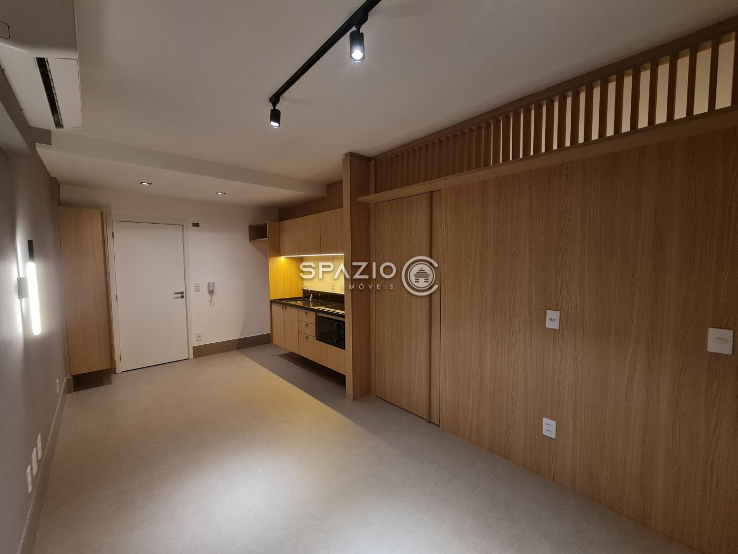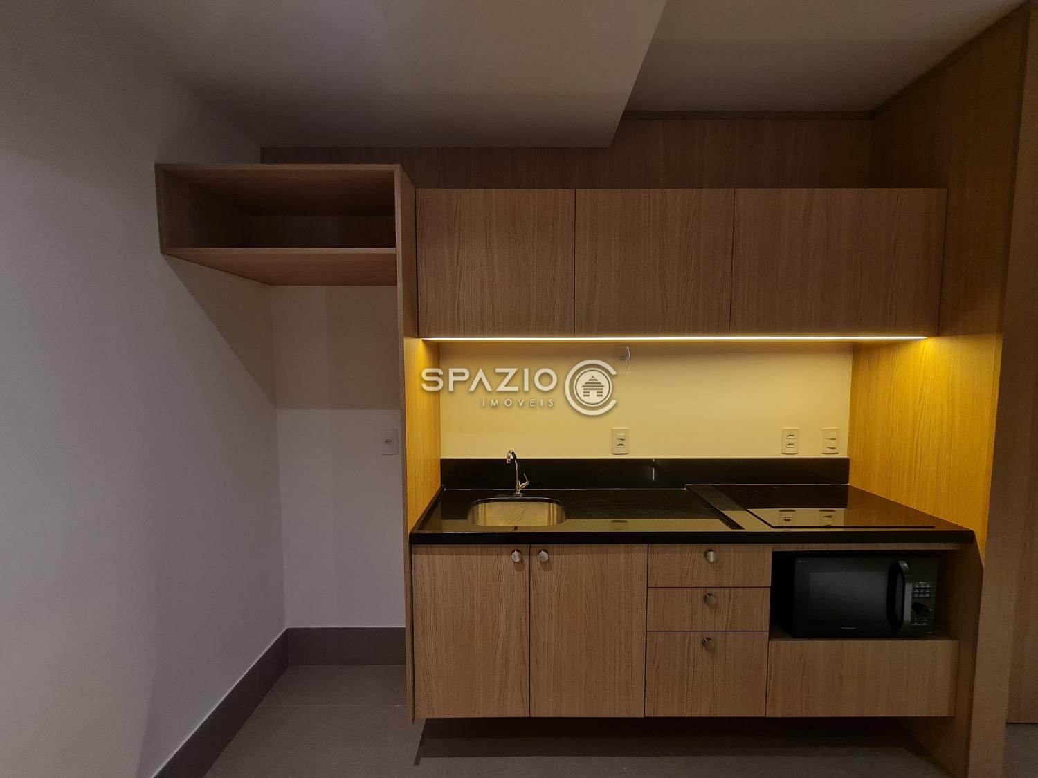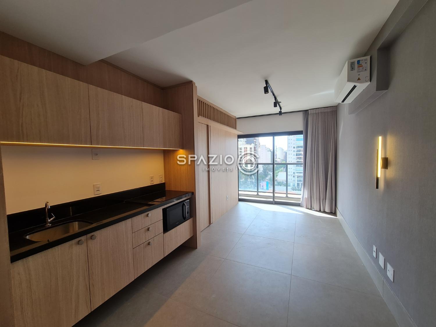 O ambiente conta com dormitório, banheiro, cozinha integrada com marcenaria planejada e equipada com eletrodomésticos principais (cooktop de indução e micro-ondas), além de uma charmosa varanda com vista para a cidade. O living é bem aproveitado e garante um espaço funcional para o dia a dia.