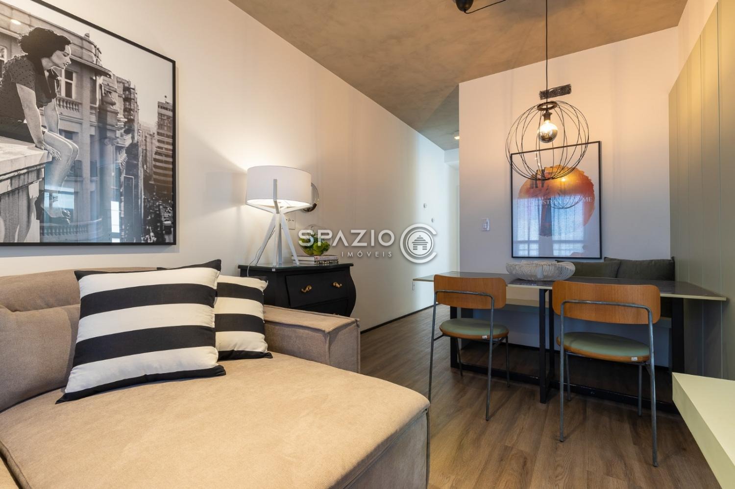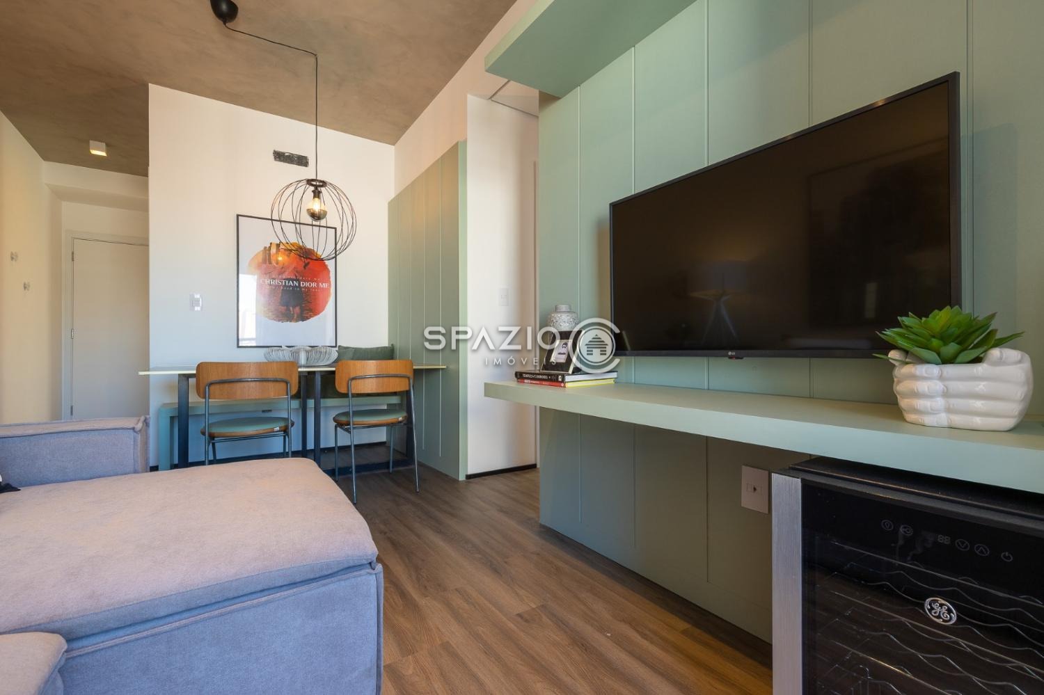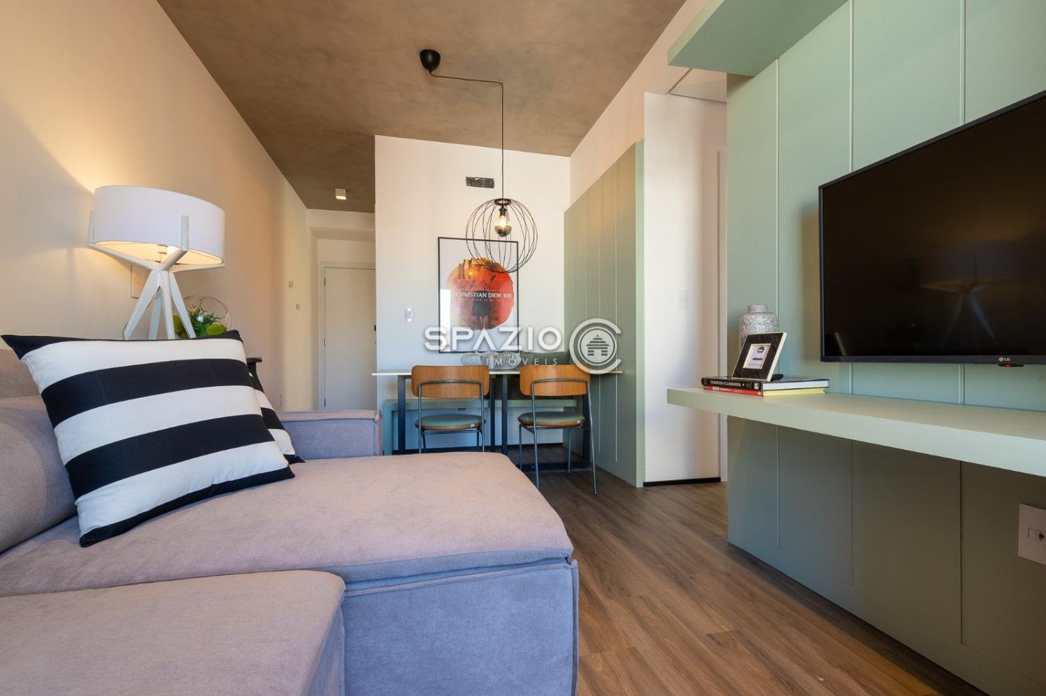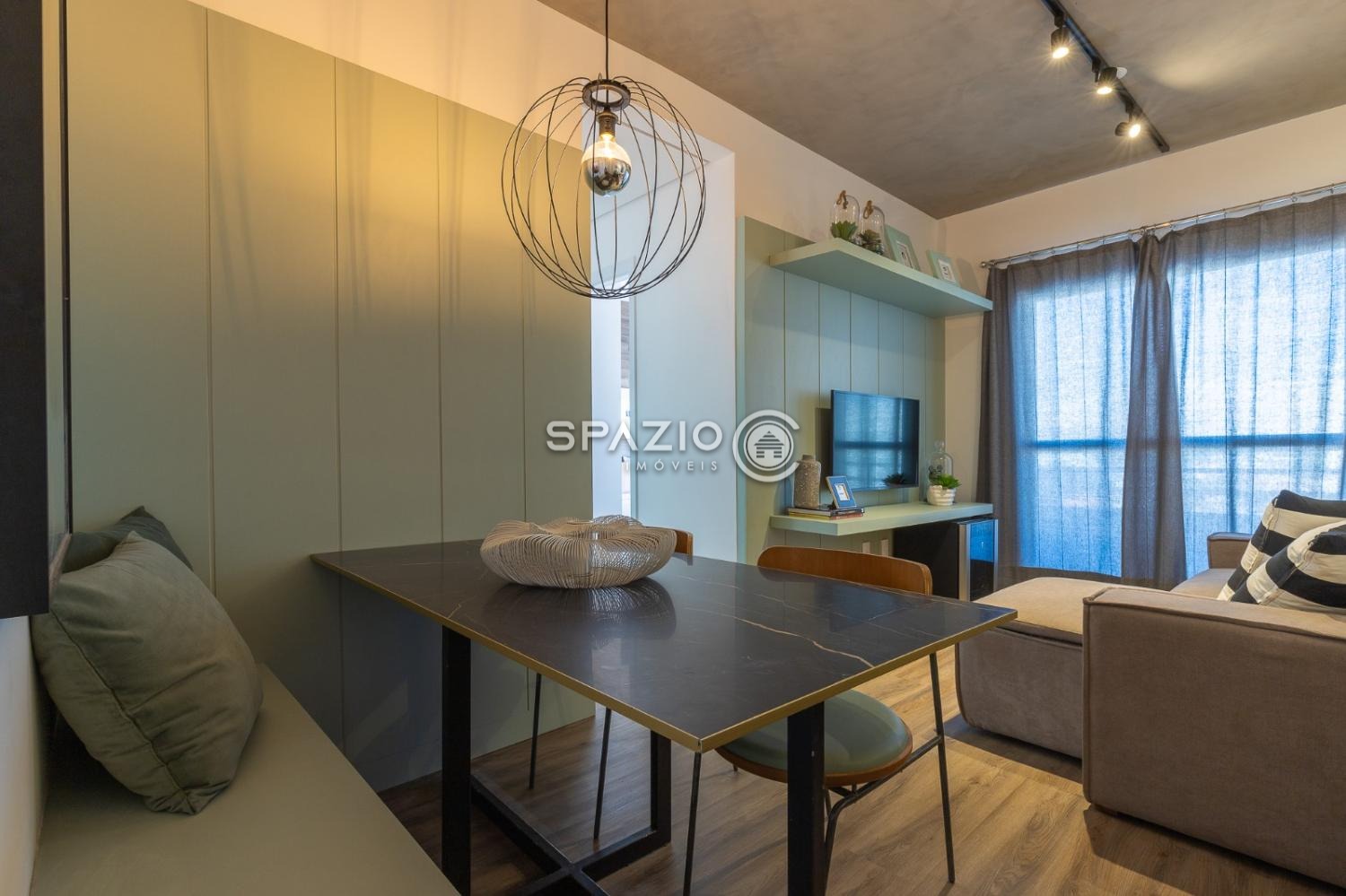 Sofá com chaise retrátil com TV 43 polegadas + mesa de jantar para 4 lugares, cozinha toda