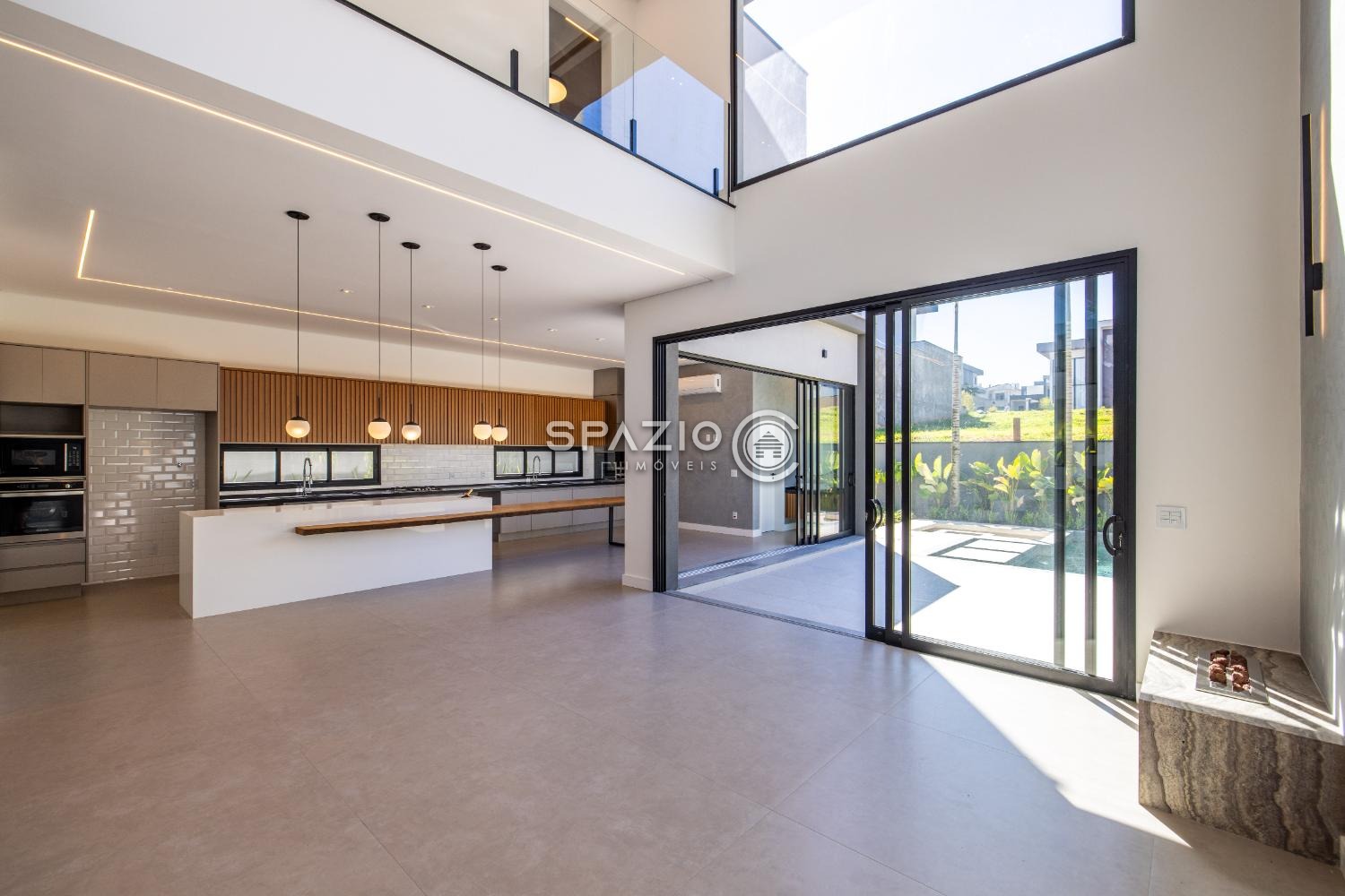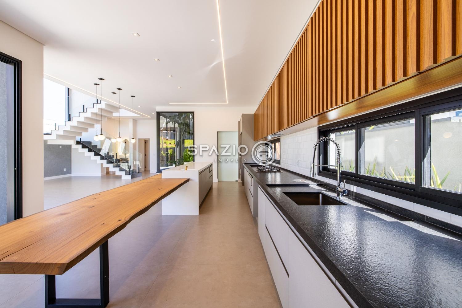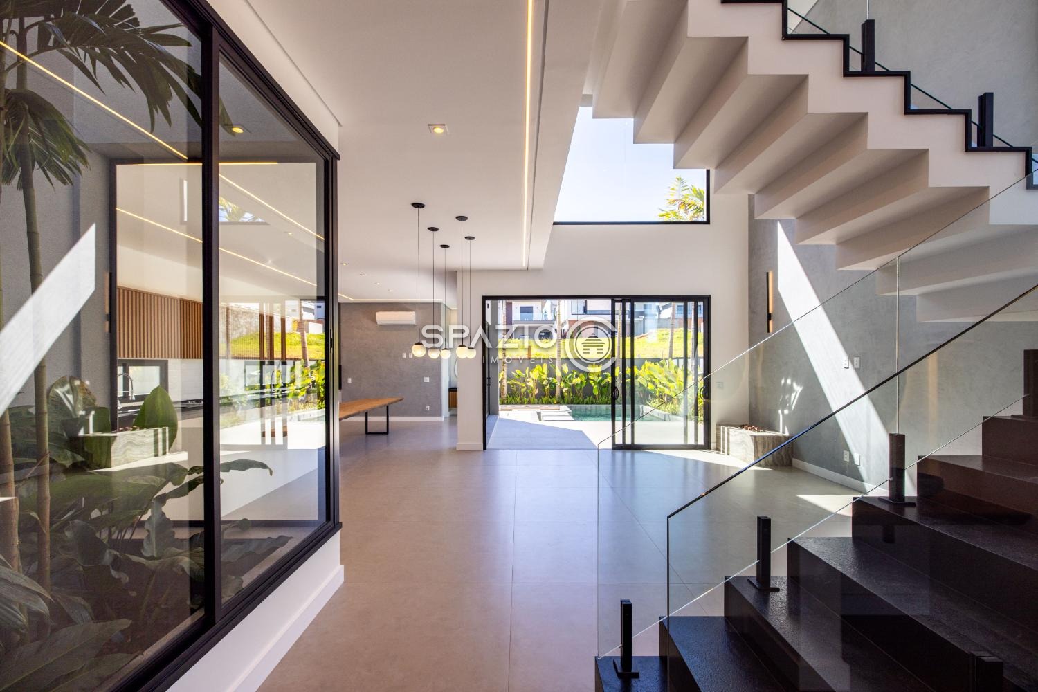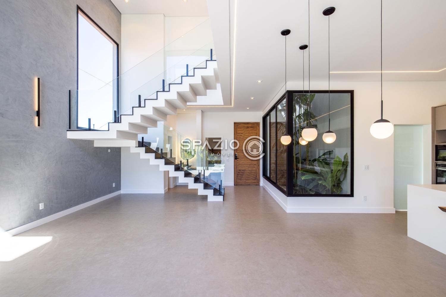 O projeto impressiona pelo living com pé-direito duplo, jardim de inverno, lavabo e uma cozinha moderna com ilha central, equipada com eletrodomésticos e armários planejados.