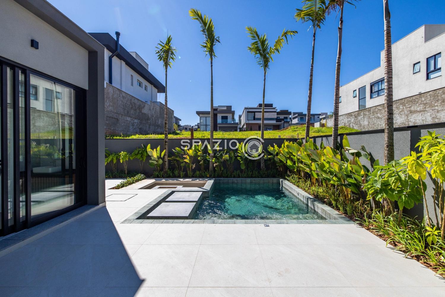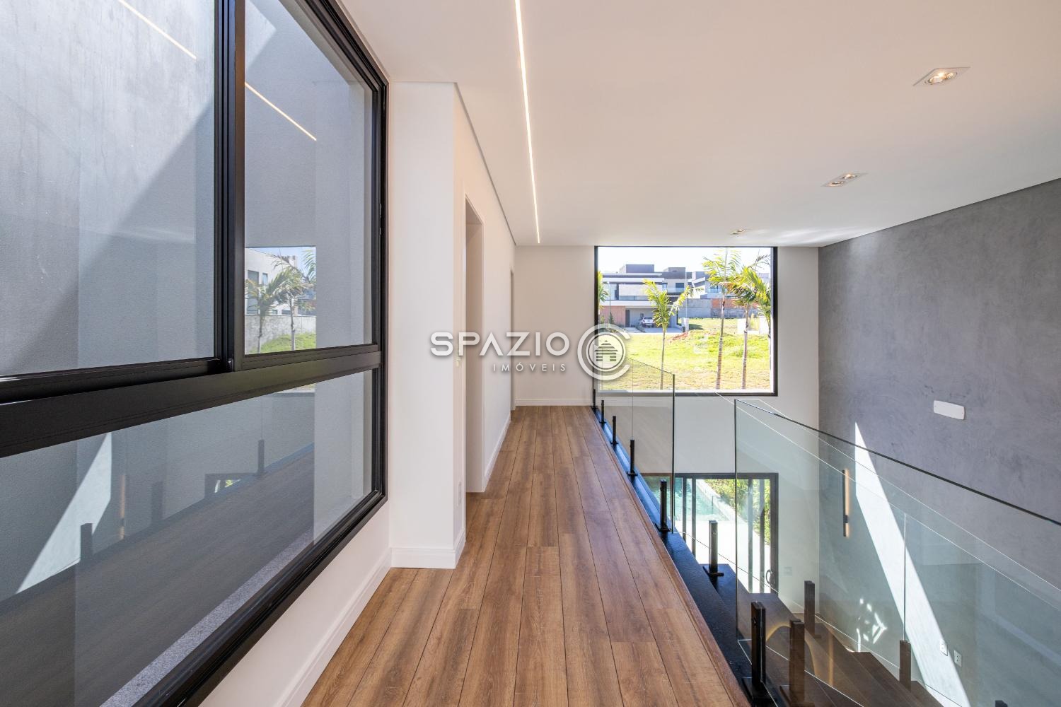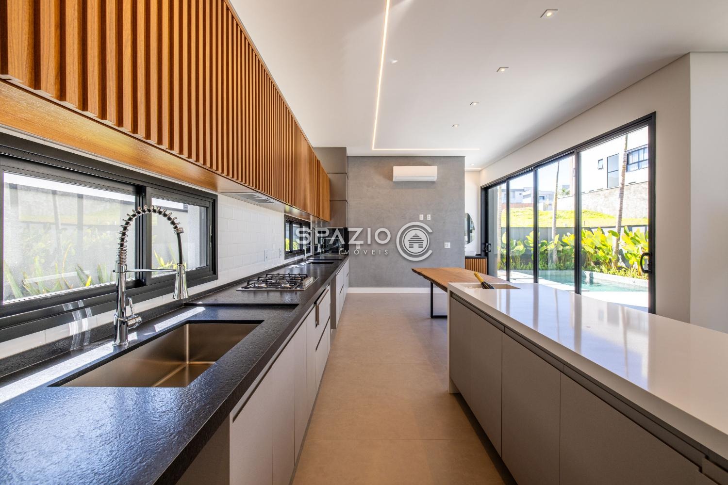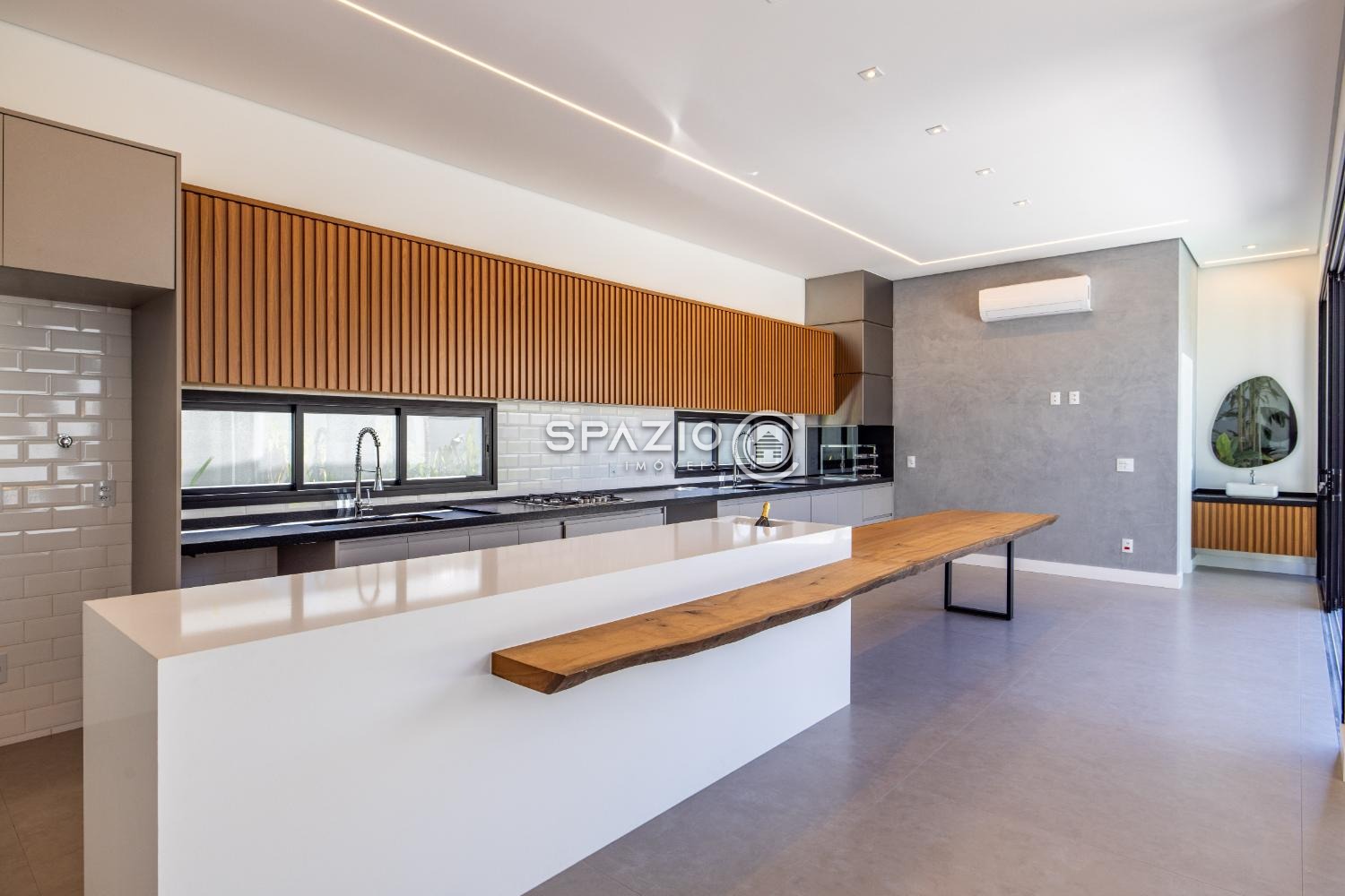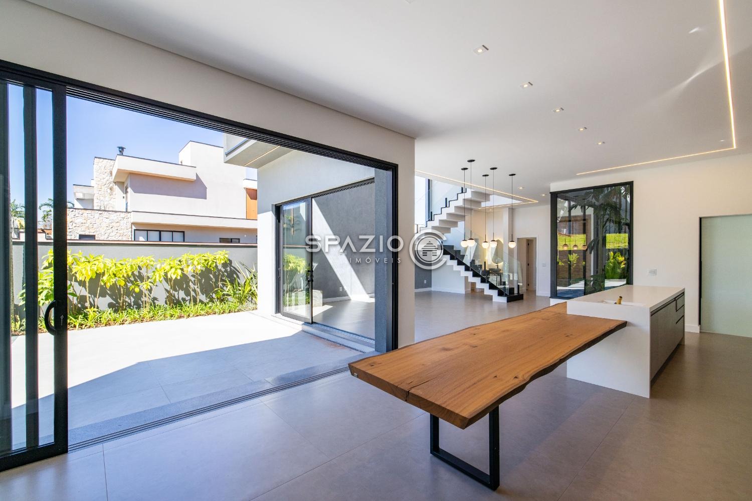 O projeto impressiona pelo living com pé-direito duplo, jardim de inverno, lavabo e uma cozinha moderna com ilha central, equipada com eletrodomésticos e armários planejados.