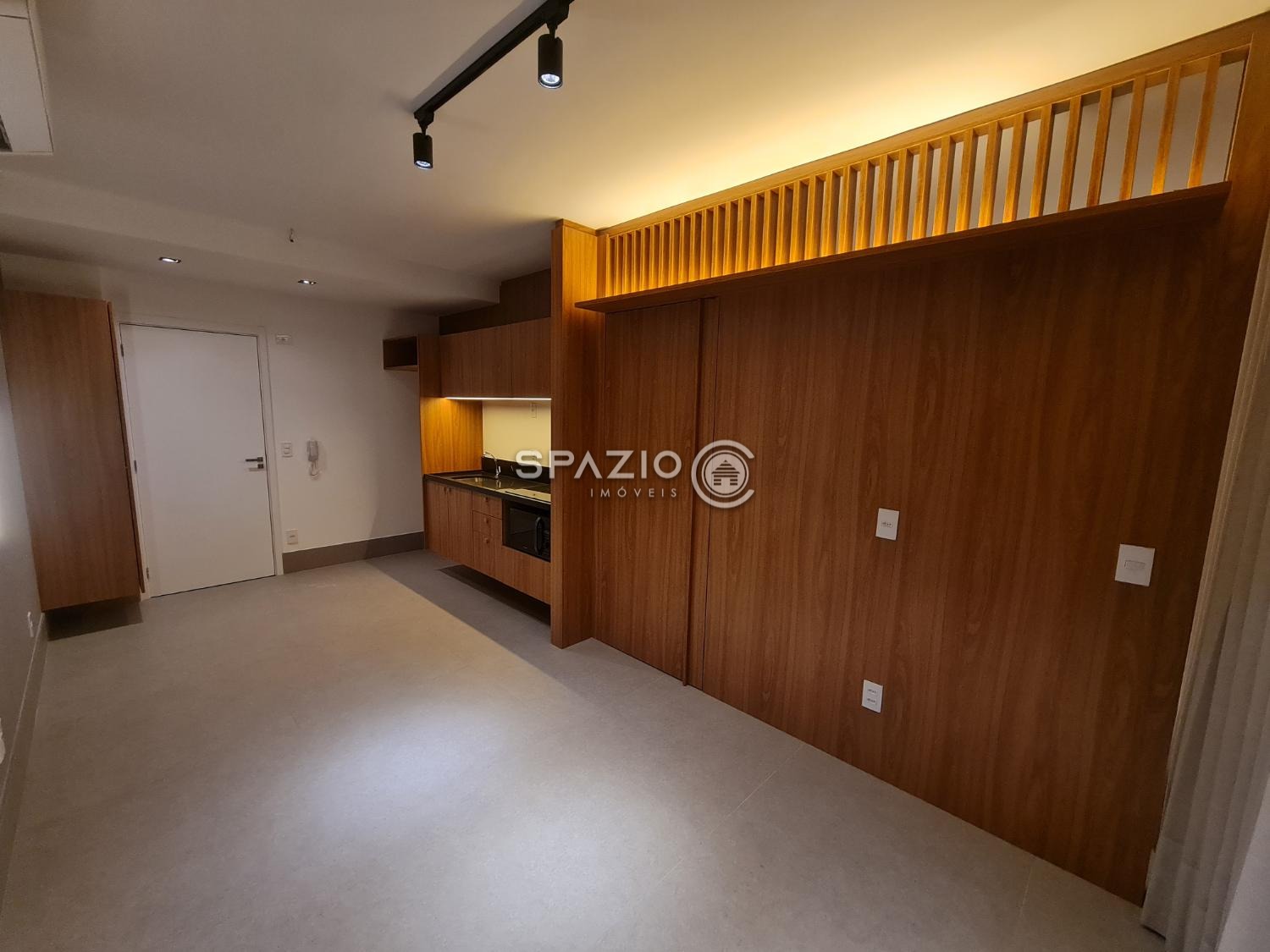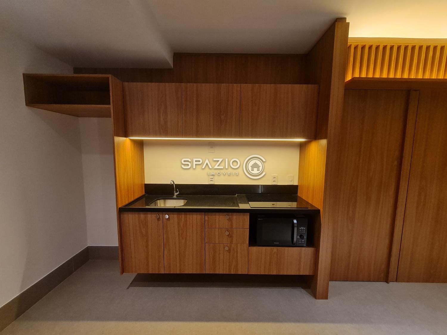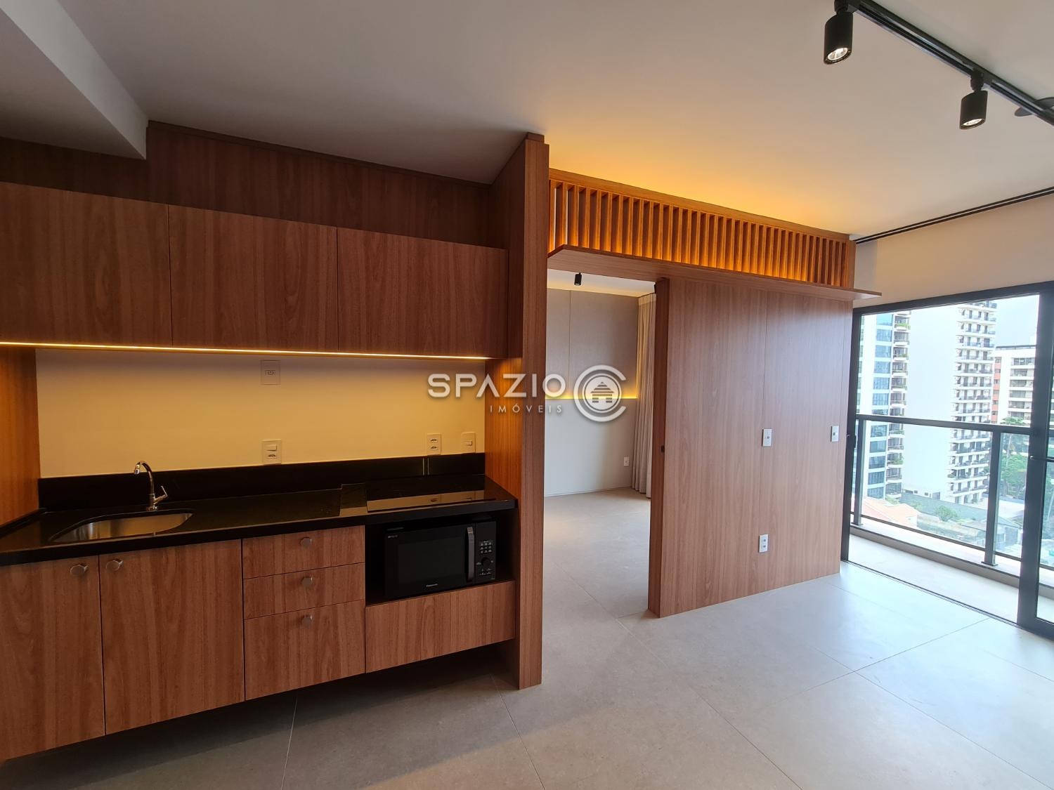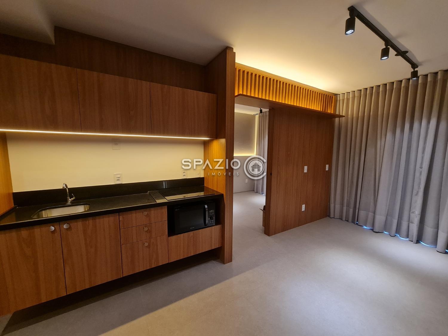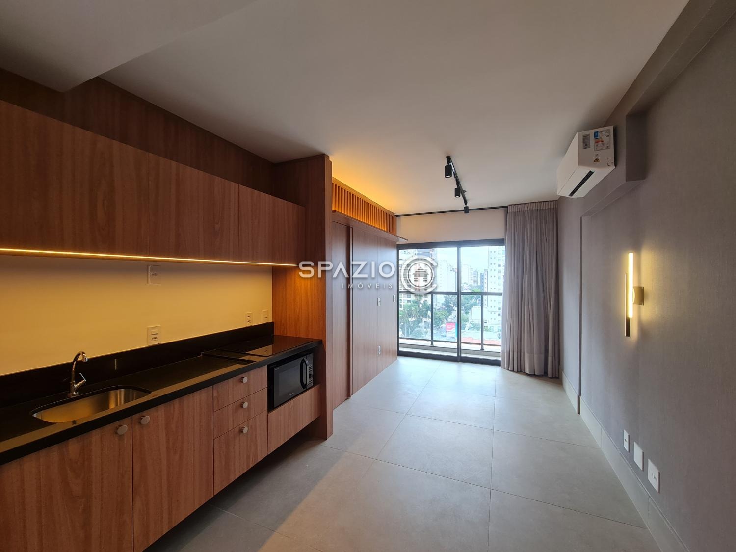 O ambiente conta com dormitório, banheiro, cozinha integrada com marcenaria planejada e equipada com eletrodomésticos principais (cooktop de indução e micro-ondas), além de uma charmosa varanda com vista para a cidade. O living é bem aproveitado e garante um espaço funcional para o dia a dia.